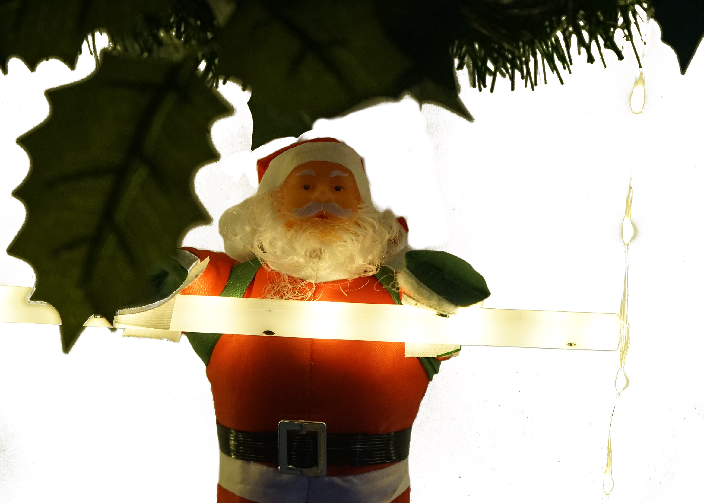 At the base of this wreath sits an adorable Santa Claus figure, bringing joy and smiles to anyone who sees it. Encircled by shimmering Christmas tinsel garlands, the wreath exudes holiday cheer from every angle. When night falls, the built-in LED lights come alive, casting a warm glow that creates a magical ambiance both indoors and outdoors.
