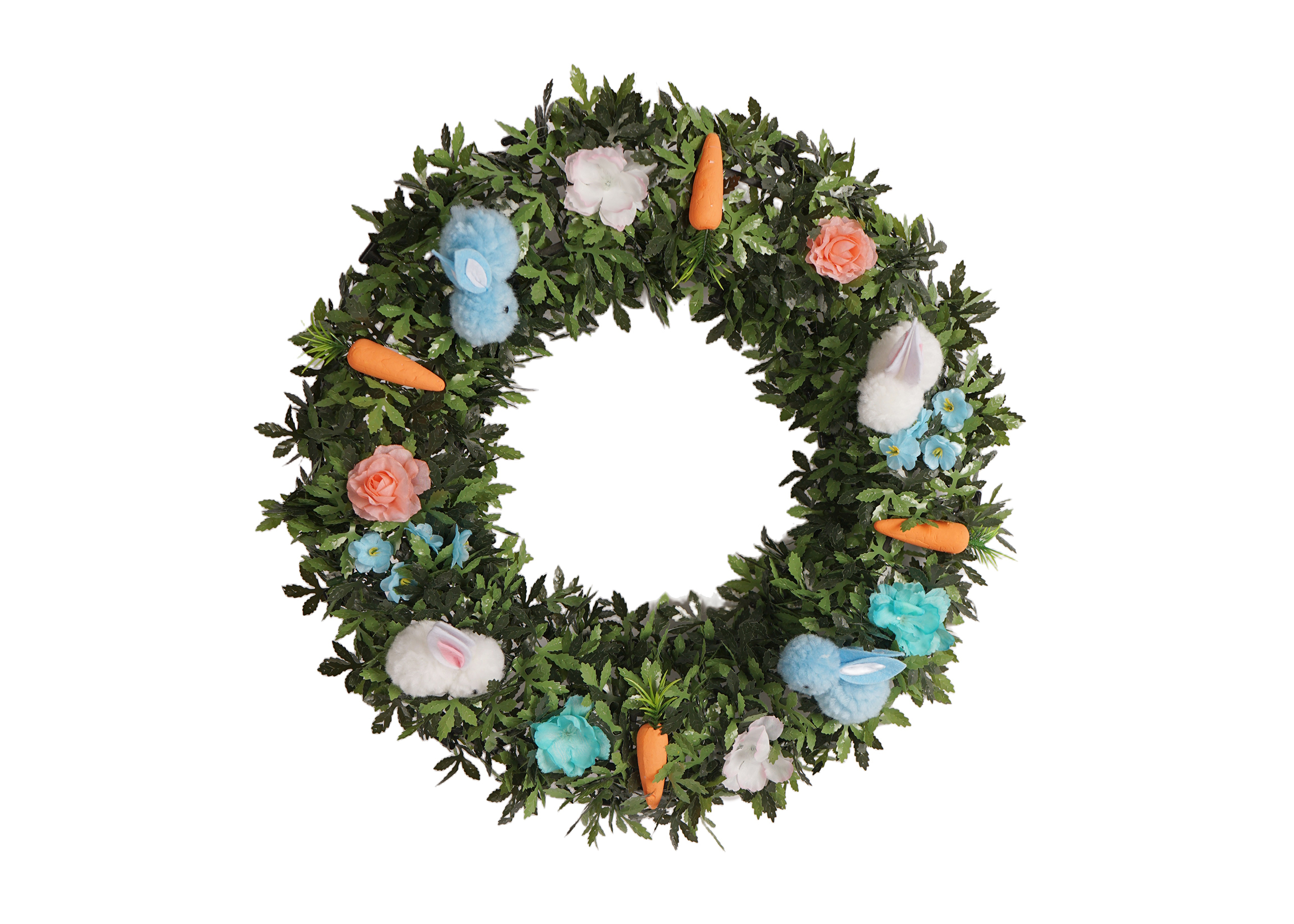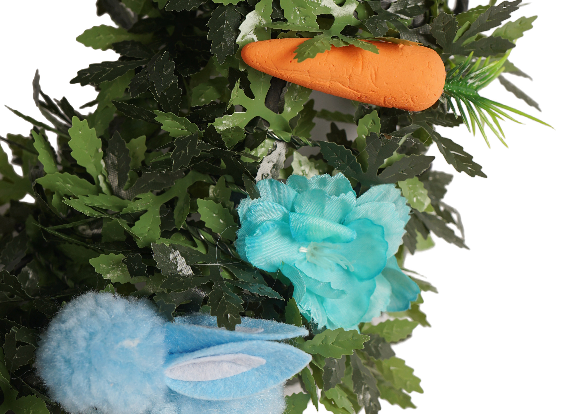 With their lifelike appearance, chubby bodies, and fluffy textures, they seem to be happily foraging in the grass, instantly bringing a smile to your face. And then there are the carrot decorations. The combination of orange – red and emerald – green is full of natural charm, as if they’ve just been pulled out from a springtime countryside field, adding a touch of rustic charm to the entire wreath.