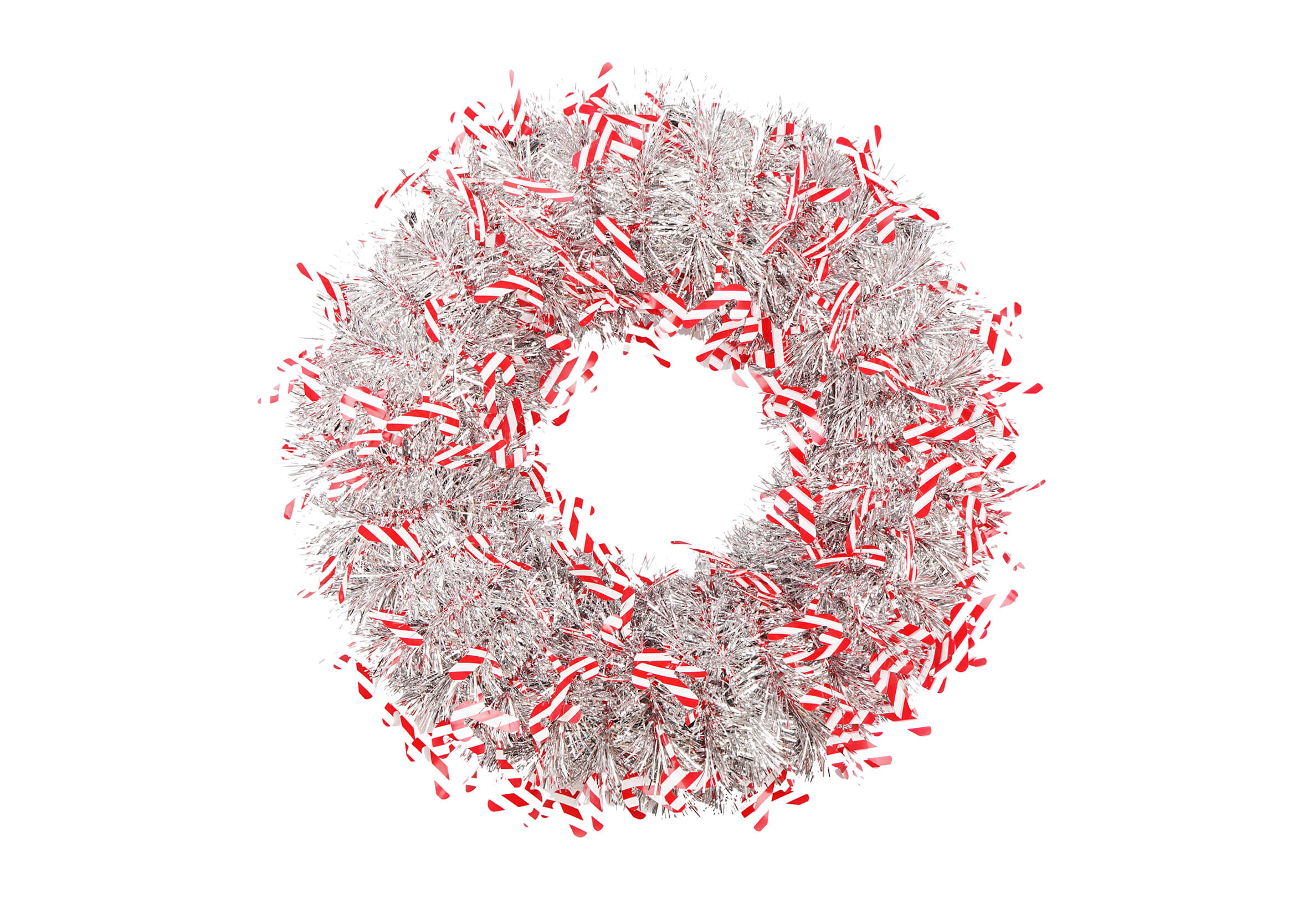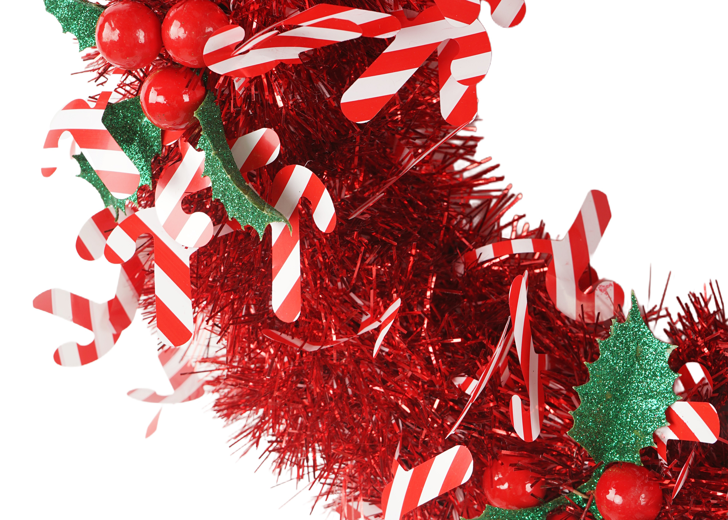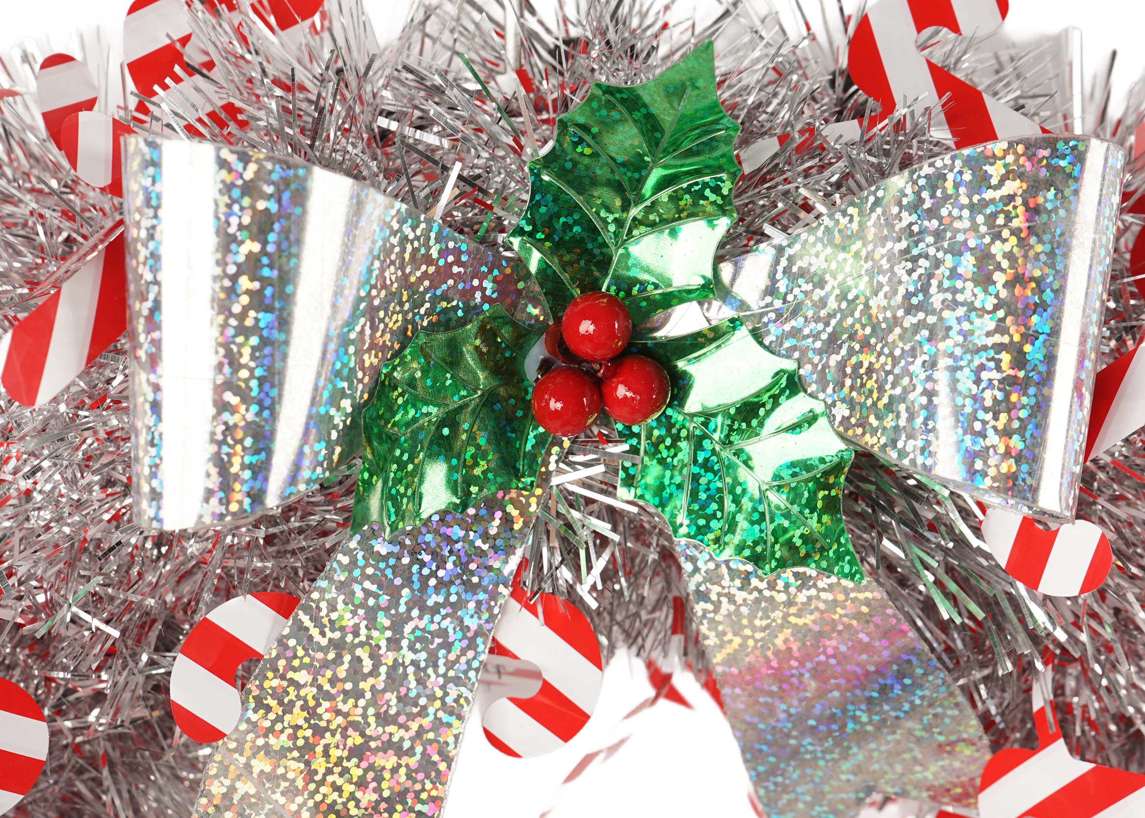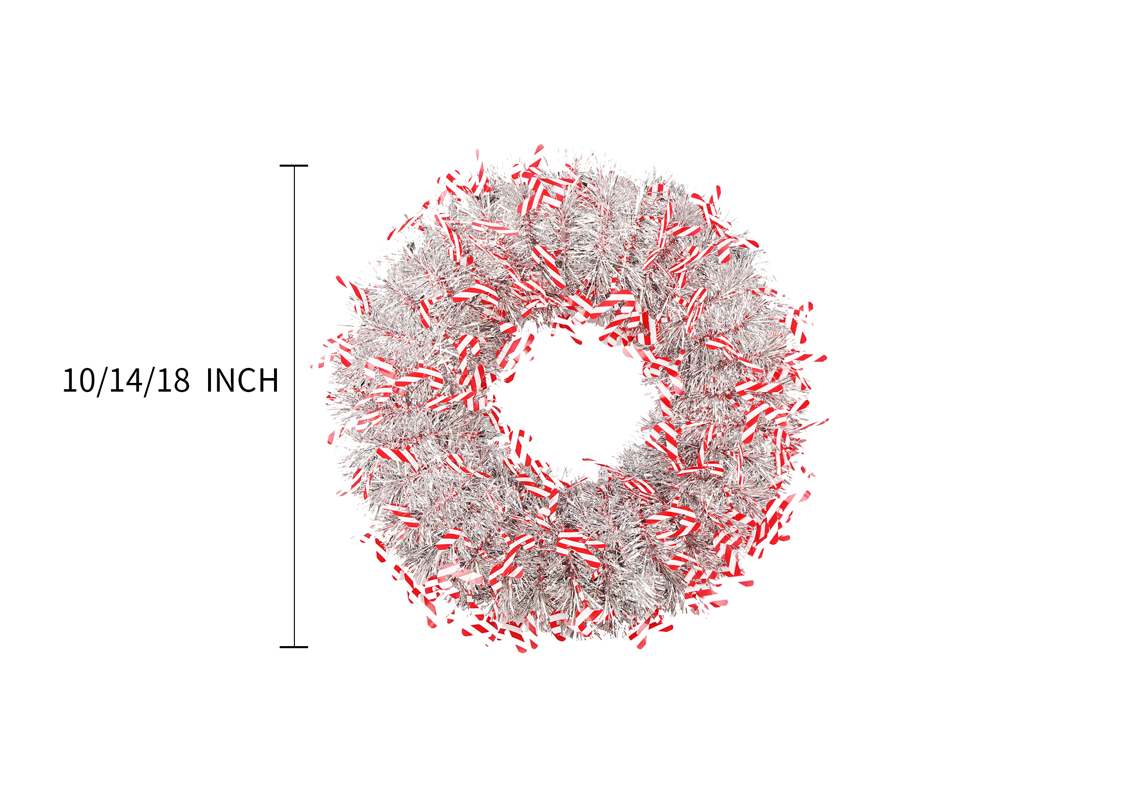 The high-quality white tinsel provides a sparkling base, while the red tinsel garland adds a vibrant contrast. The red and white candy decorations are strategically placed to enhance the wreath’s festive appeal, making it perfect for capturing the holiday spirit.
