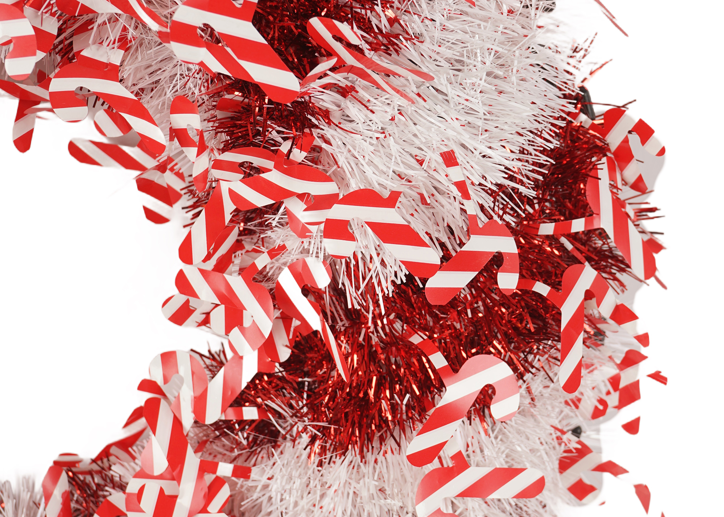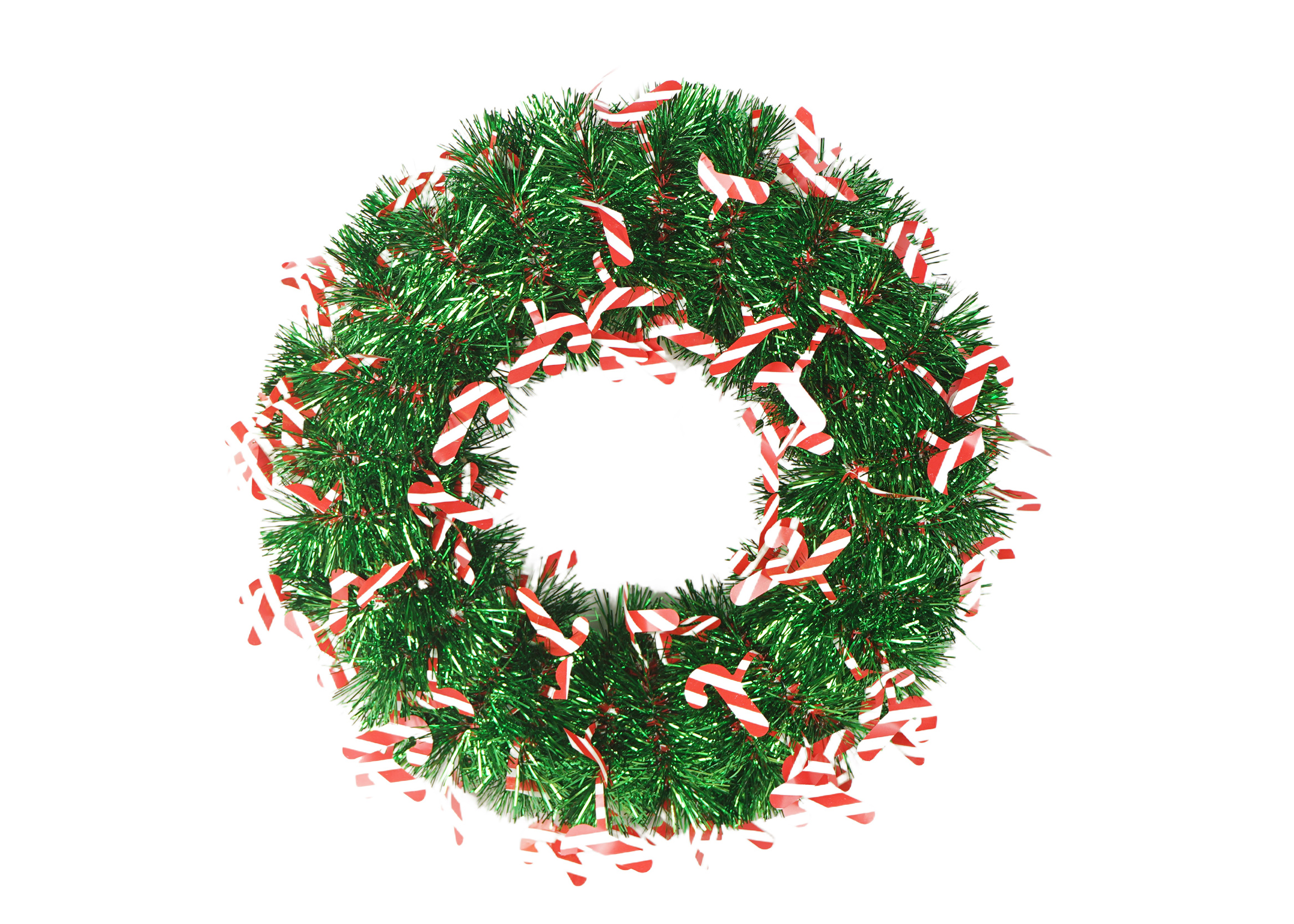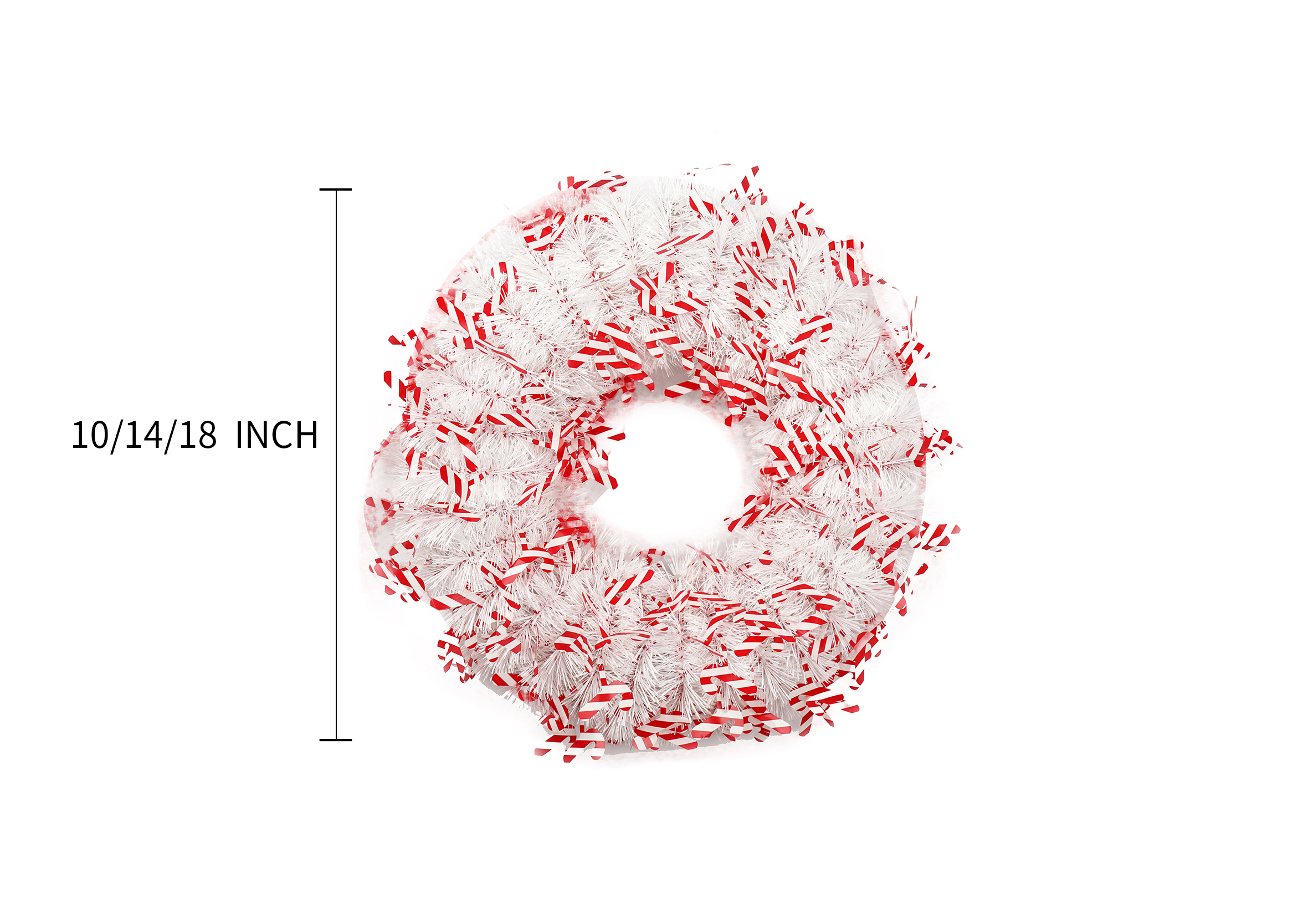 The high-quality white tinsel provides a sparkling base, while the red tinsel garland adds a vibrant contrast. The red and white candy decorations are strategically placed to enhance the wreath’s festive appeal, making it perfect for capturing the holiday spirit.