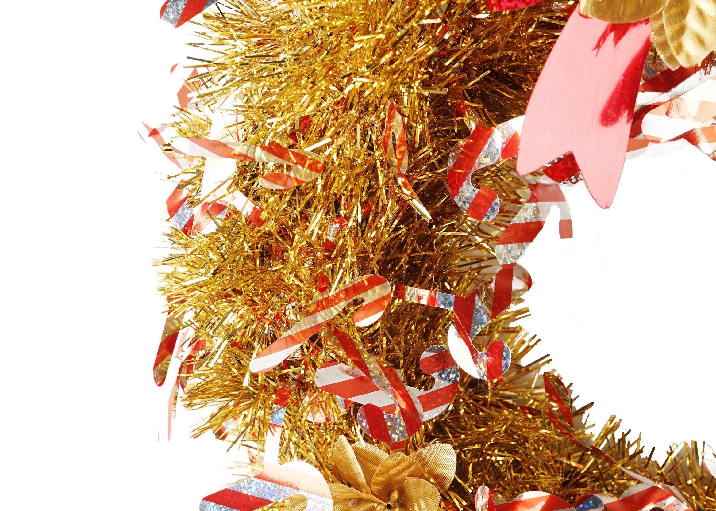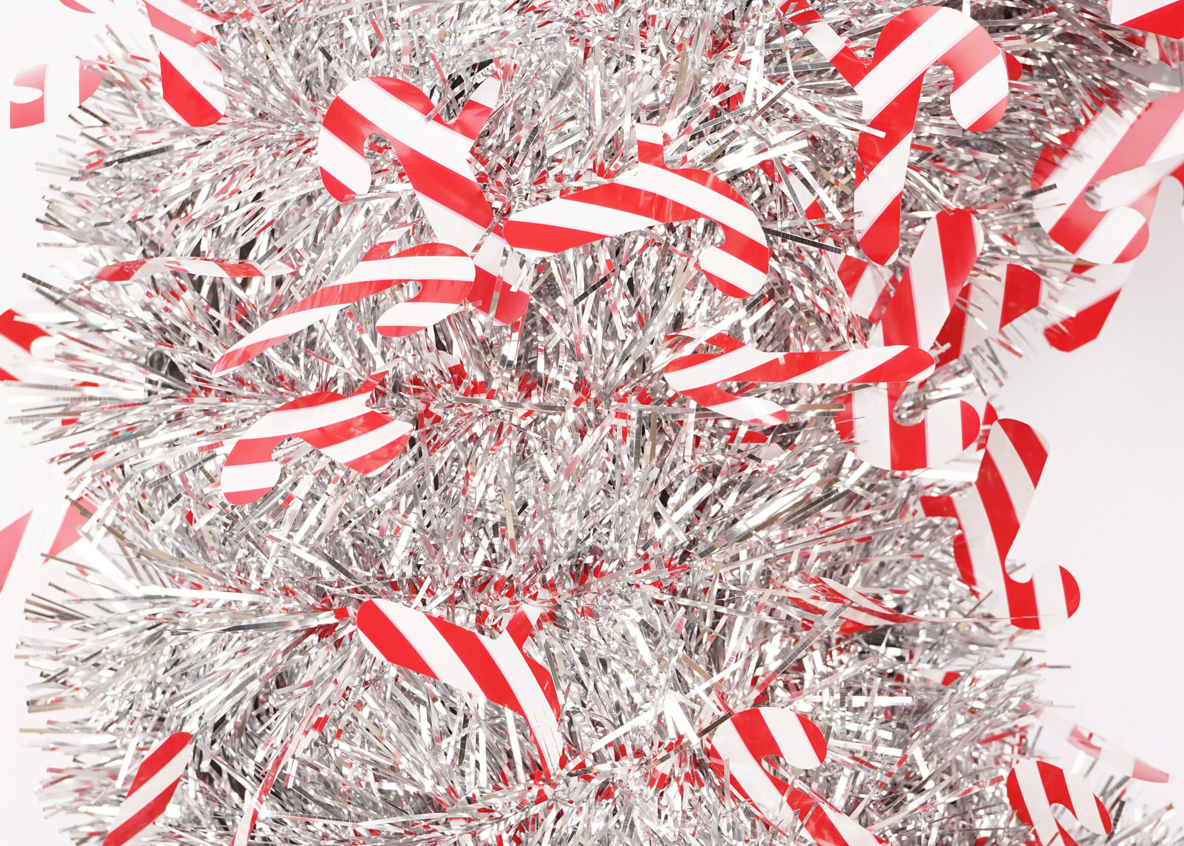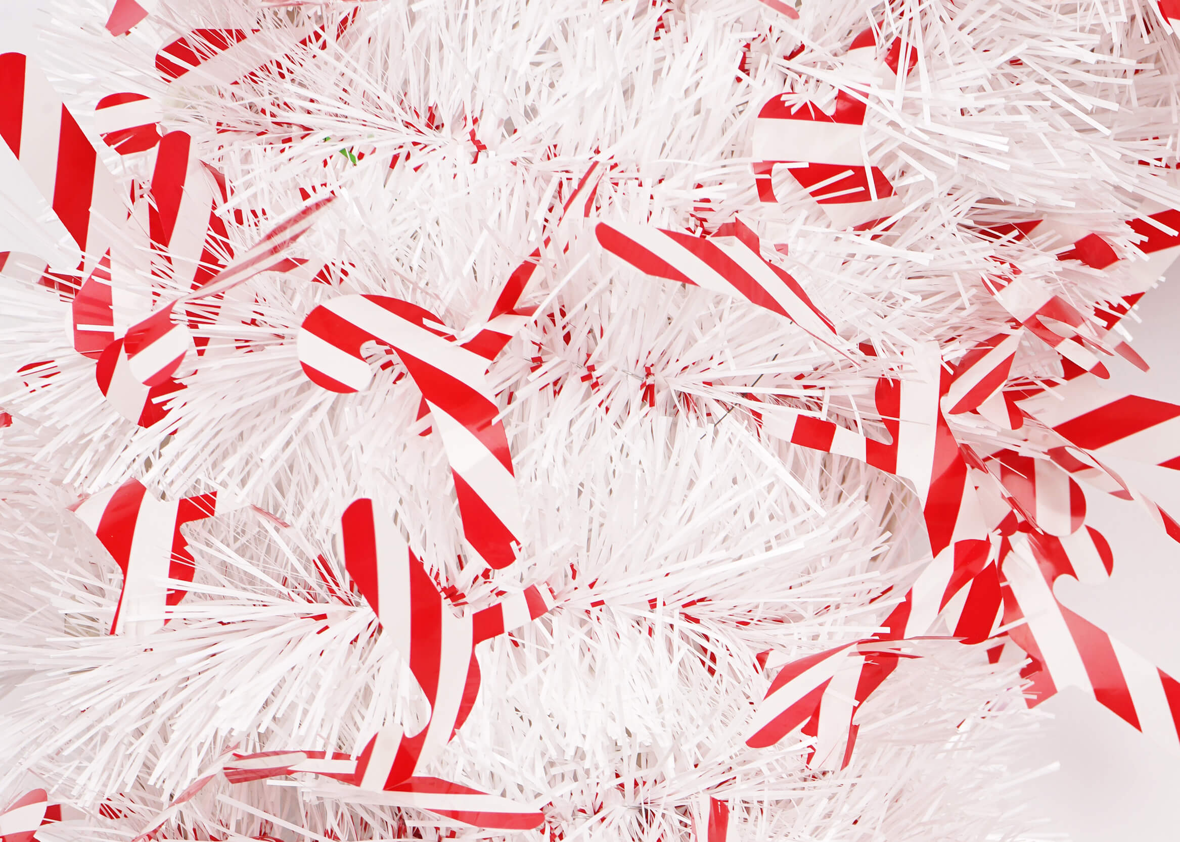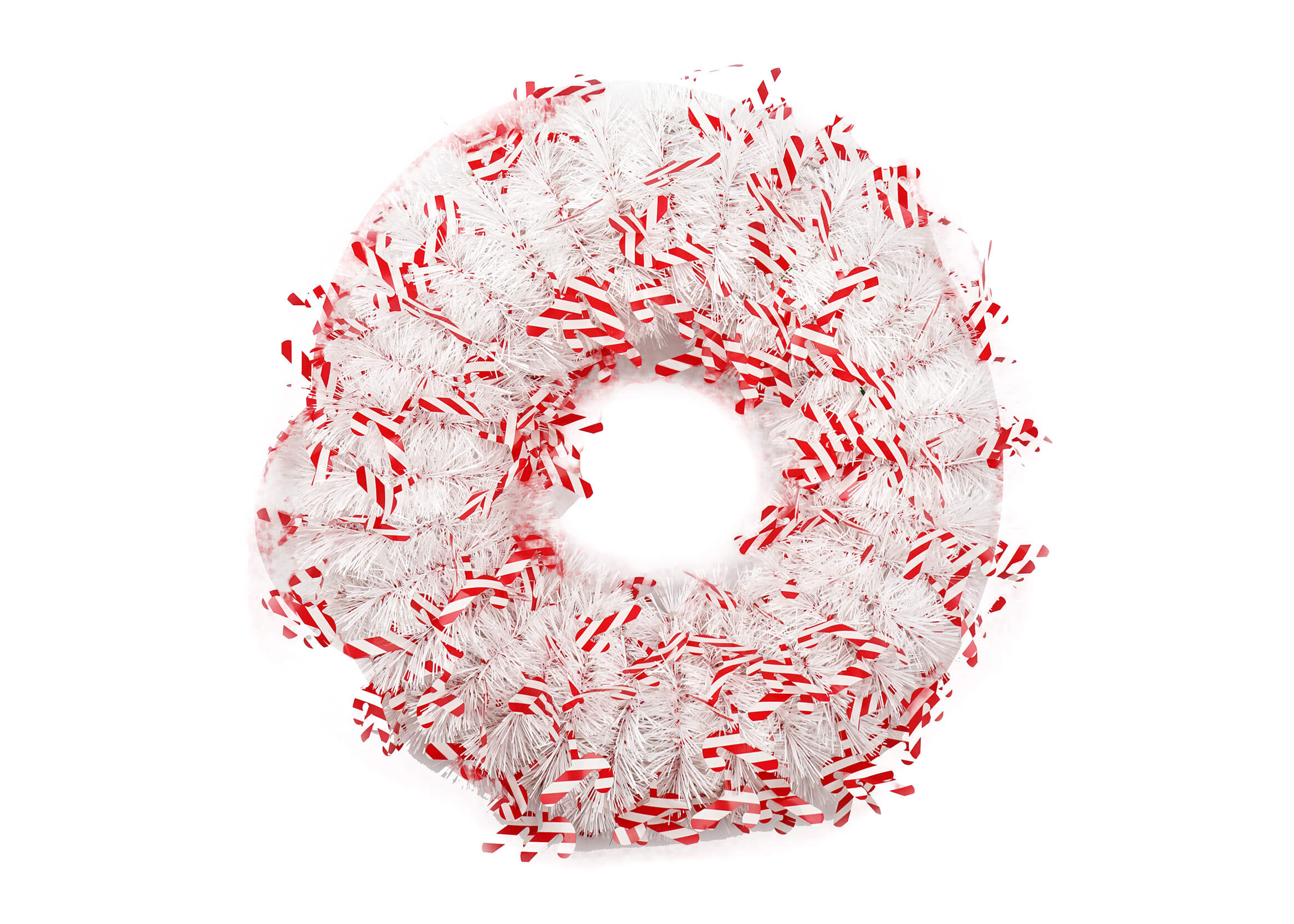 The high-quality white tinsel provides a sparkling base, while the red tinsel garland adds a vibrant contrast. The red and white candy decorations are strategically placed to enhance the wreath’s festive appeal, making it perfect for capturing the holiday spirit.